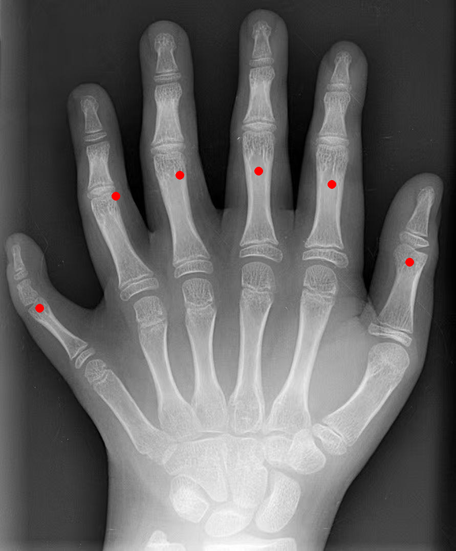 数手指:给一张手部 X 光片,让模型用坐标标出所有手指的位置。模型准确识别并标注了 6 个手指(包括左右两侧拇指和中间 4 个手指)