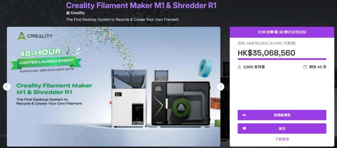 2026年4月2日,南极熊获悉,创想三维旗下创想生态推出的首款桌面级耗材生成系统——Creality Filament Maker M1 & Shredder R1(耗材生成器M1 & 粉碎机R1)正式登陆全球最大科技众筹平台之一Indiegogo,众筹价格为1199美金,以20分钟破1000万人民币、首日破3000万人民币的惊人成绩,刷新了Indiegogo历史3D打印项目众筹纪录,成为2026年全球3D打印众筹项目“王者”。